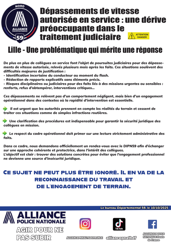 LILLE : DEPASSEMENTS DE VITESSE AUTORISEE EN SERVICE Une dérive préoccupante dans le traitement judiciaire ... Publication : 10 octobre 2025 Lire la suite... Nord, Bureau Régional, Hauts de France